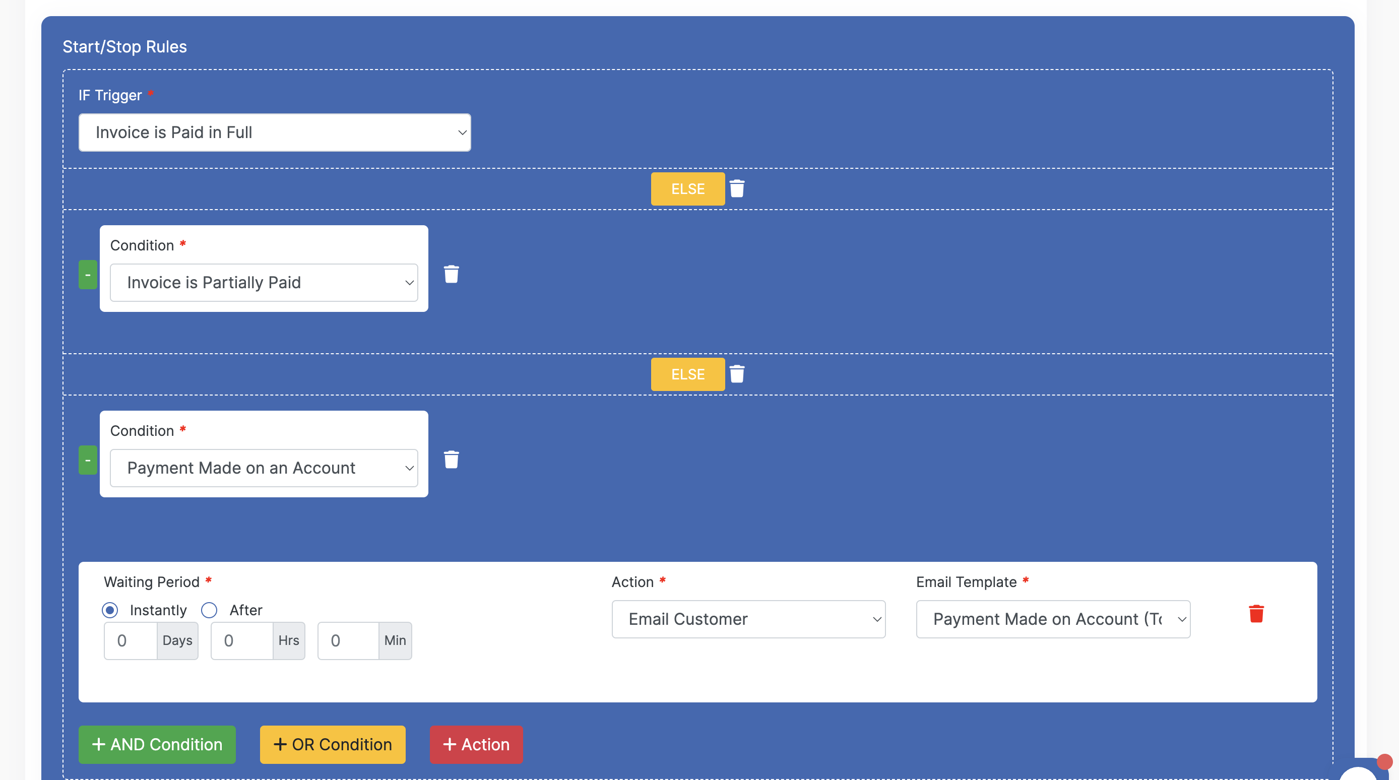 This automation means that if an invoice is paid in full or in partial, or a payment in general was made, then our new template will be emailed to the customer.
