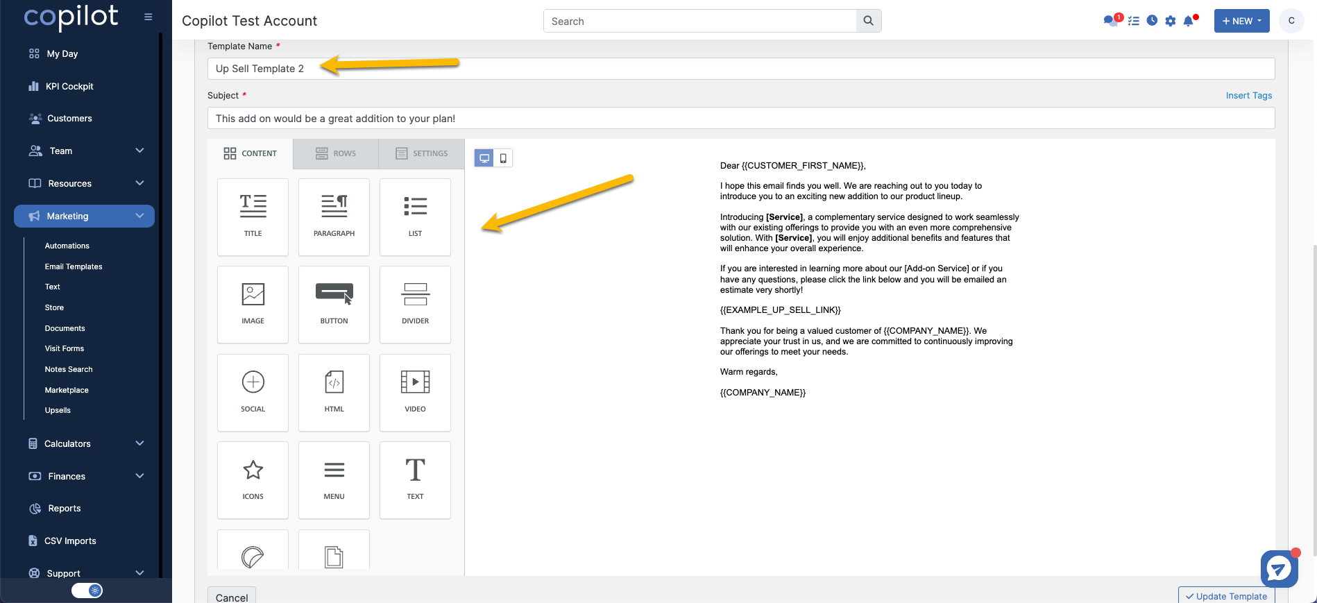 First, you'll need to set up some email templates that better describe the services you'd like to upsell and create the content you'd like on that txt or email template that will be sent out to the customer. You can start creating those templates by selecting "Marketing>Email templates".